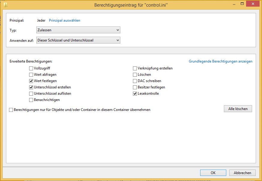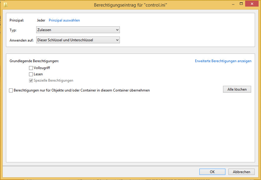 Dazu wird ein Rechtsklick auf den jeweiligen Schlüssel Control.ini gemacht und die Option Berechtigungen (Permissions) gewählt. Falls es noch keinen Berechtigungseintrag für “Jeder” (Everyone) gibt, so muss dieser hizugefügt werden. Gibt es einen solchen Eintrag bereits, wird dieser ausgewählt und bearbeitet.